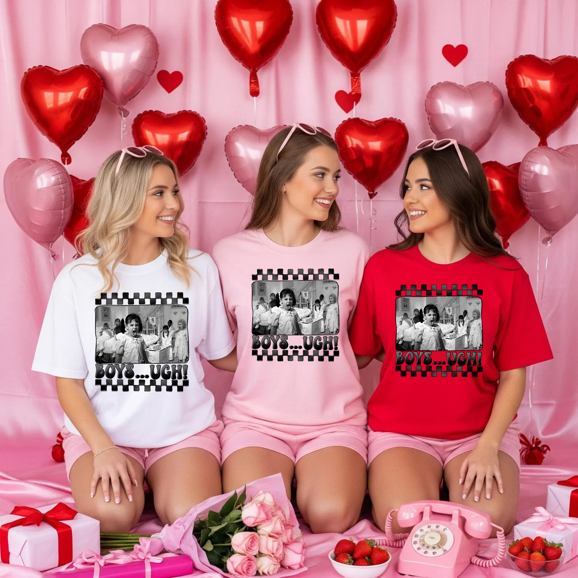 Celebrate girl power and nostalgic fun with this playful Valentine's tee! Inspired by a beloved classic sleepover scene, this shirt captures that iconic "Boys...Ugh" attitude with a retro movie graphic that'll have fellow fans grinning. Perfect for Valentine's Day or any day you want to rock a little attitude with style. Soft, comfortable, and unapologetically fun—because sometimes the best company is your girlfriends.