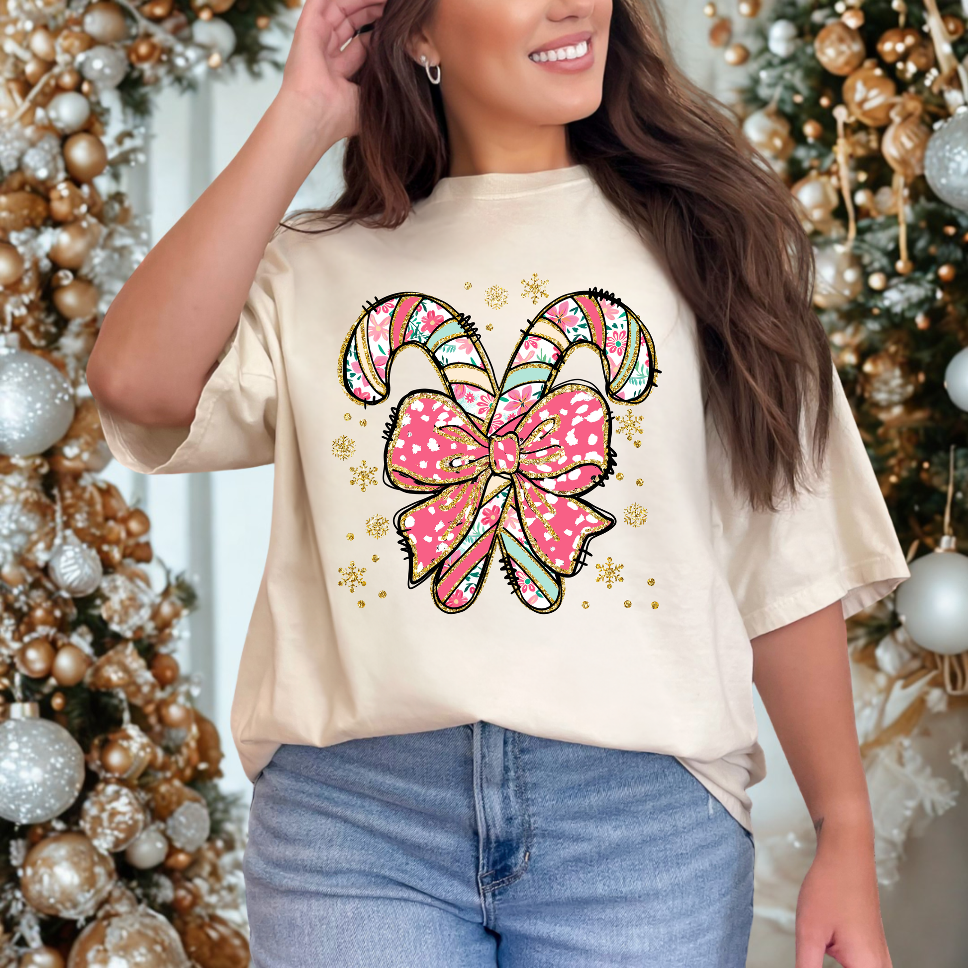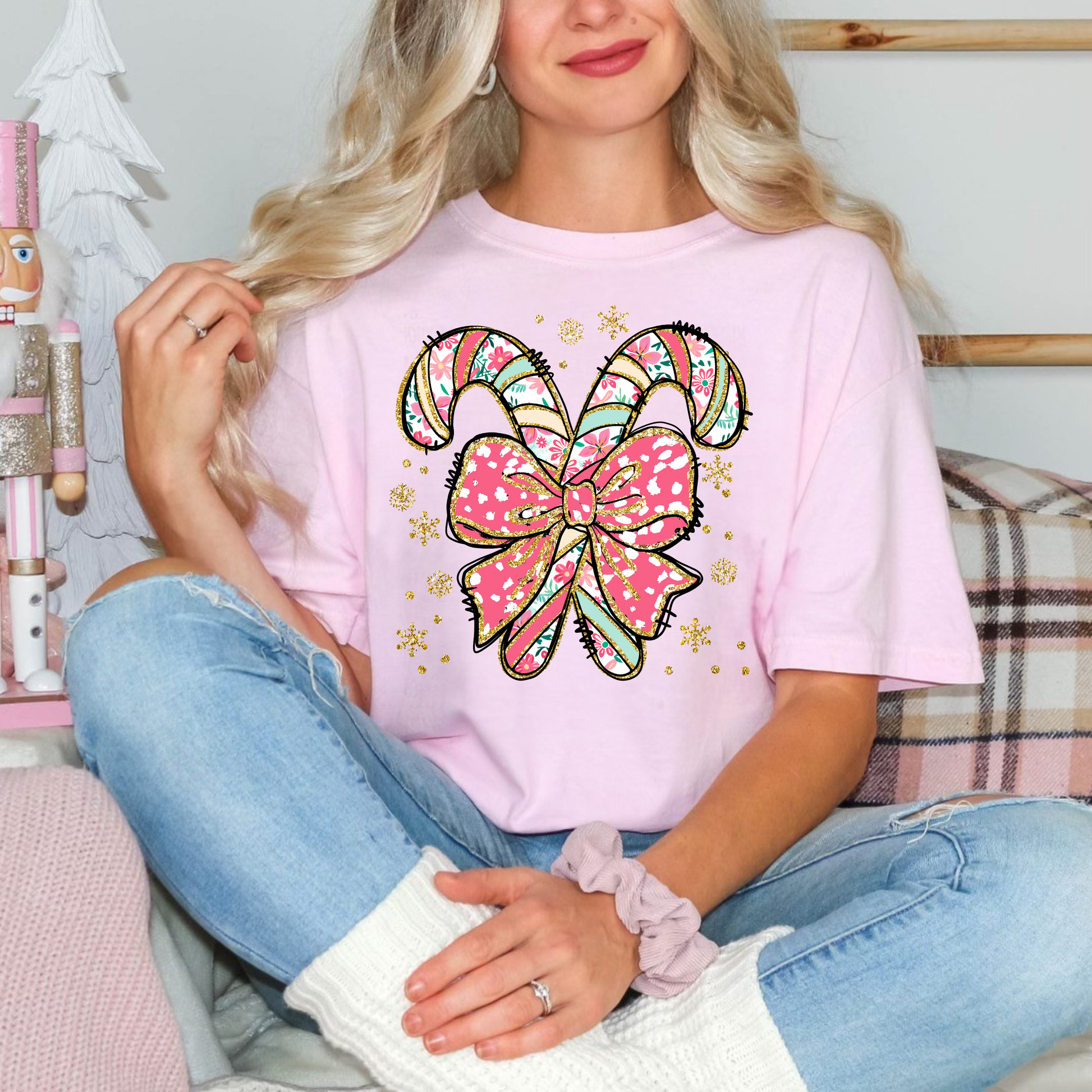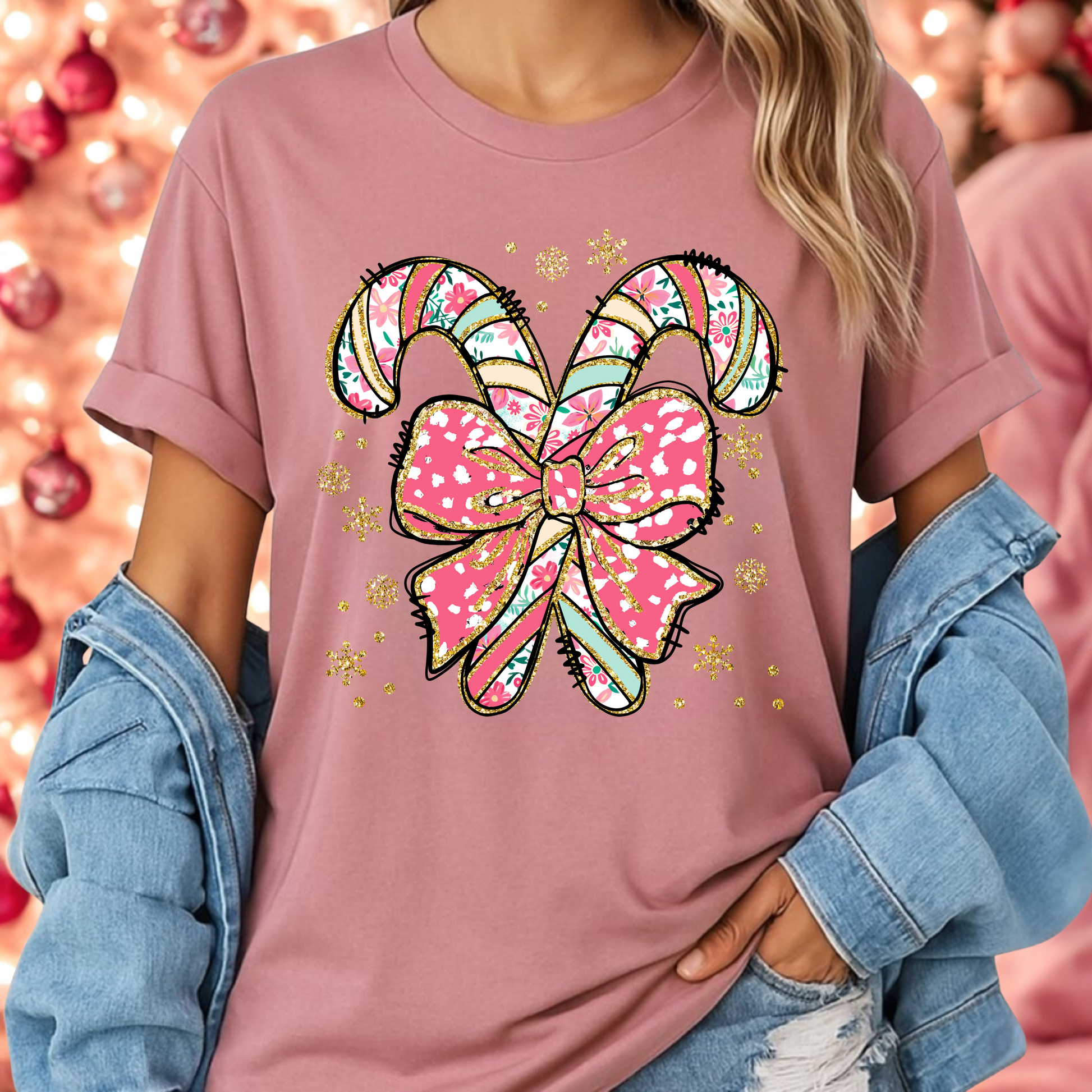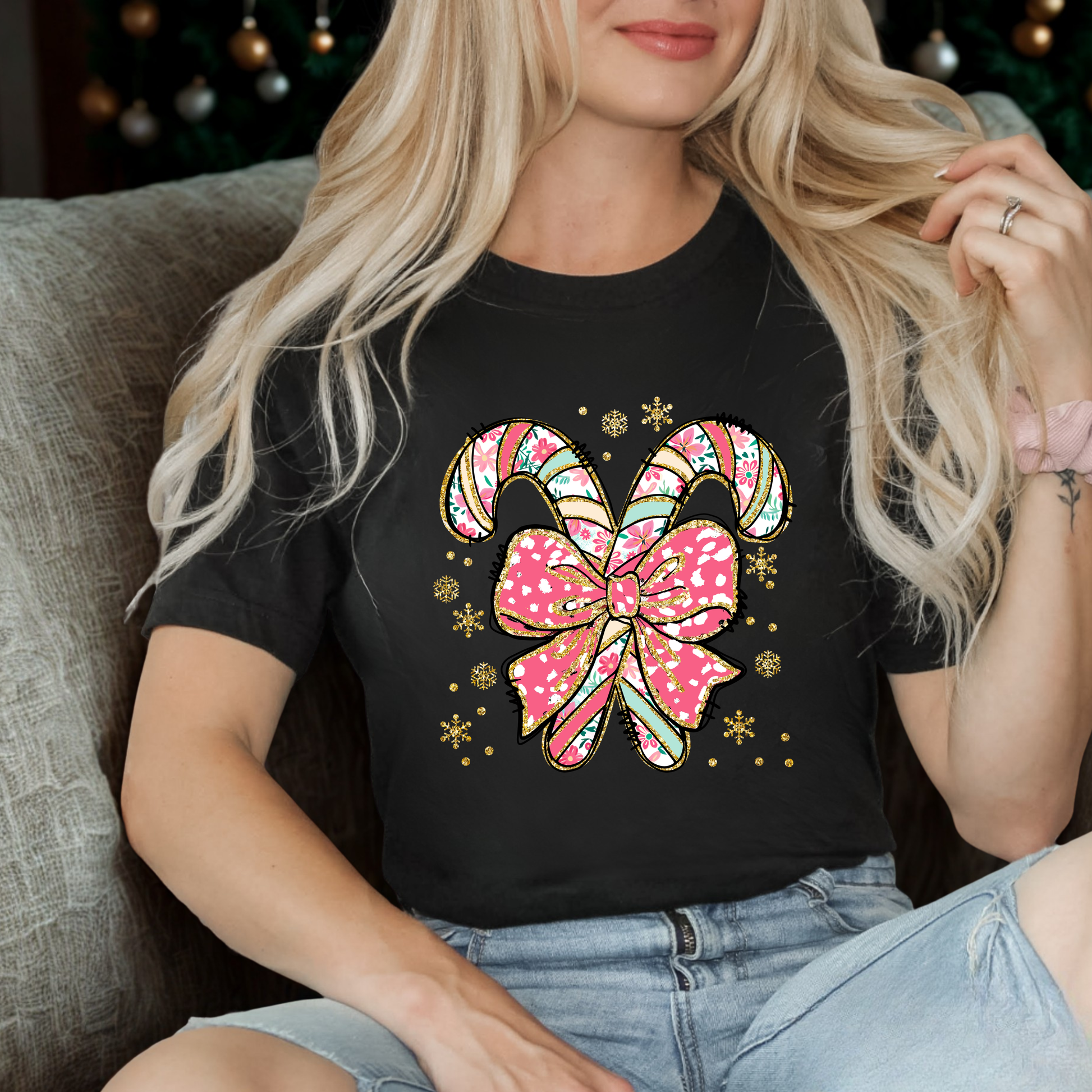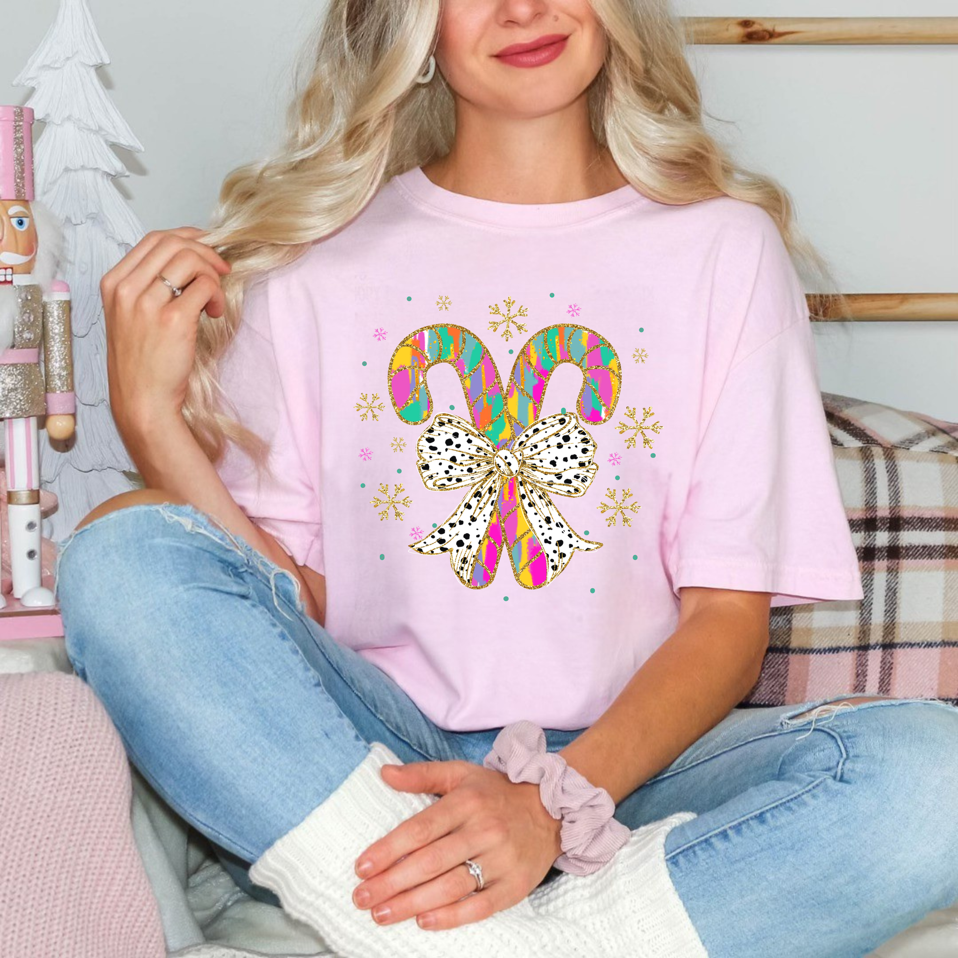 Spread festive cheer with this playful women's holiday tee! Featuring whimsical candy canes bursting with color and pattern, adorned with a charming bow and shimmering gold snowflakes, it's the perfect blend of sweet and sparkly. Cozy, fun, and undeniably merry—ideal for holiday gatherings, casual celebrations, or anyone who loves a little extra seasonal magic.