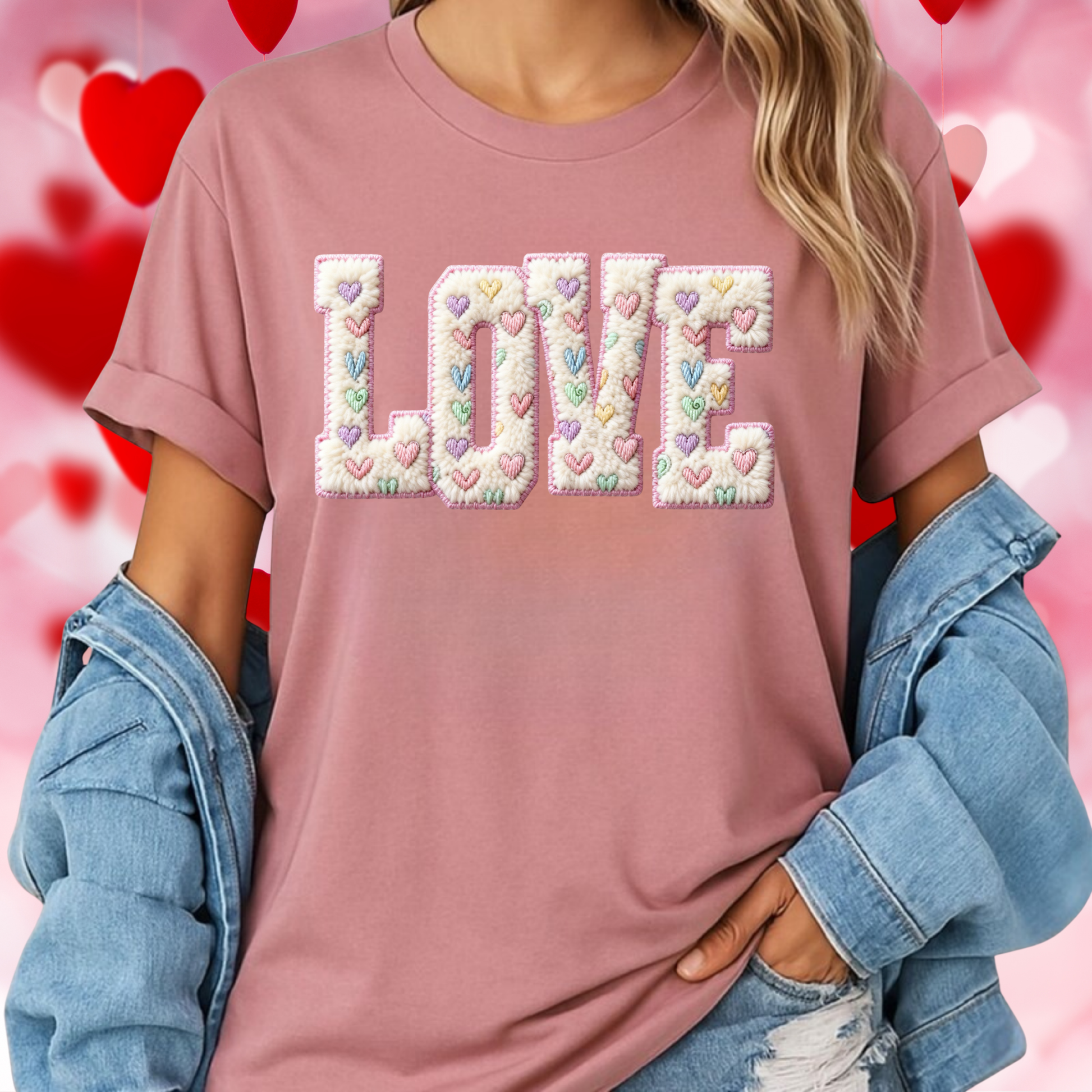 Spread the love this Valentine's season with our playful LOVE tee! Featuring a charming faux embroidered design of the word "LOVE" adorned with adorable hearts throughout, this women's tee is perfect for expressing your romantic side with a touch of fun. Soft, comfortable, and oh-so-cute, it's an ideal choice for date night, galentine's celebrations, or simply showing off your love-filled spirit. Make hearts flutter wherever you go!