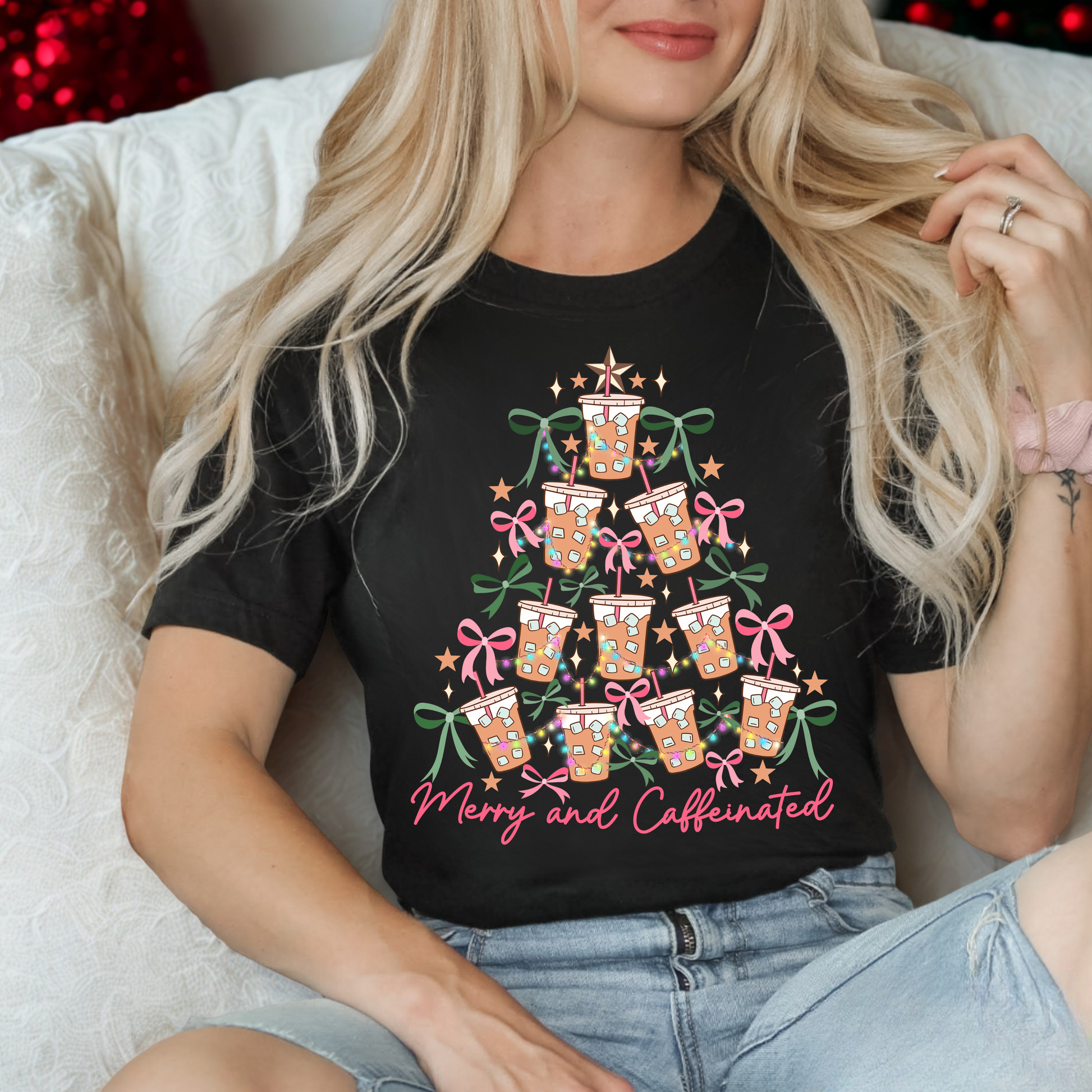 Celebrate the season with a caffeine-fueled twist! This playful women's holiday tee features a whimsical ice coffee tree adorned with festive bows and twinkling Christmas lights, paired with the perfect motto: "Merry and Caffeinated." It's the ideal gift for coffee lovers who refuse to choose between their favorite beverage and holiday cheer. Cozy, fun, and unapologetically caffeinated—because the best part of the holidays is the coffee.