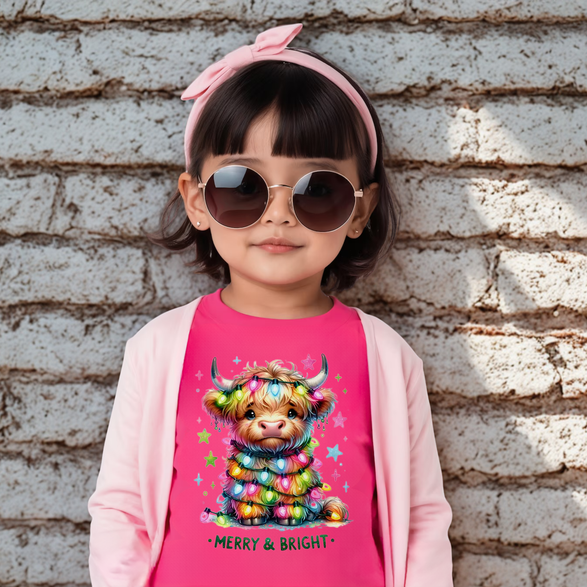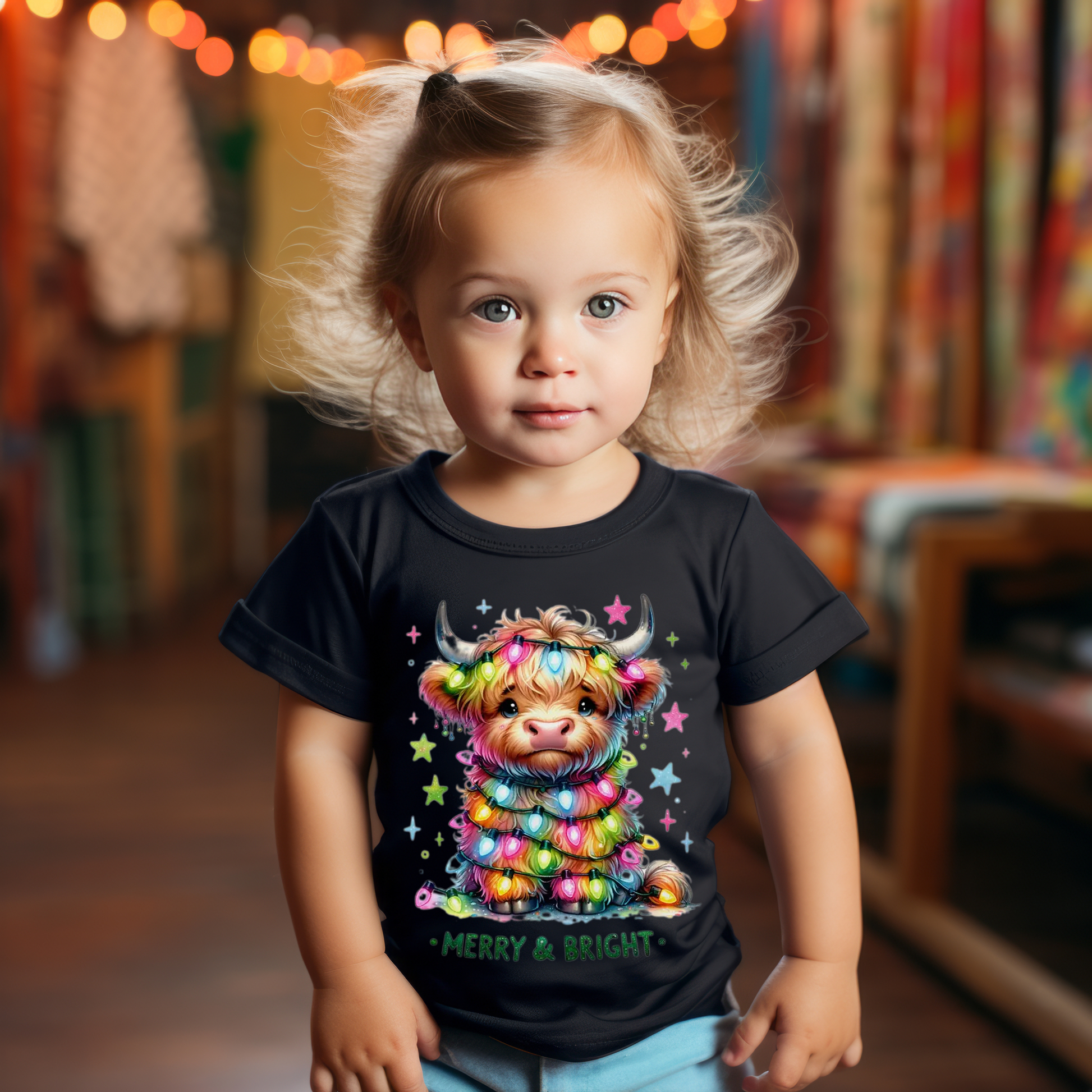 Make your toddler’s holiday extra cheerful with this playful “Merry & Bright” shirt! Featuring an adorable highland cow wrapped in colorful Christmas lights, it brings festive fun to any outfit. Soft and comfortable, it’s perfect for joyful celebrations and cozy winter days. Brighten the season with this charming tee made just for your little one!