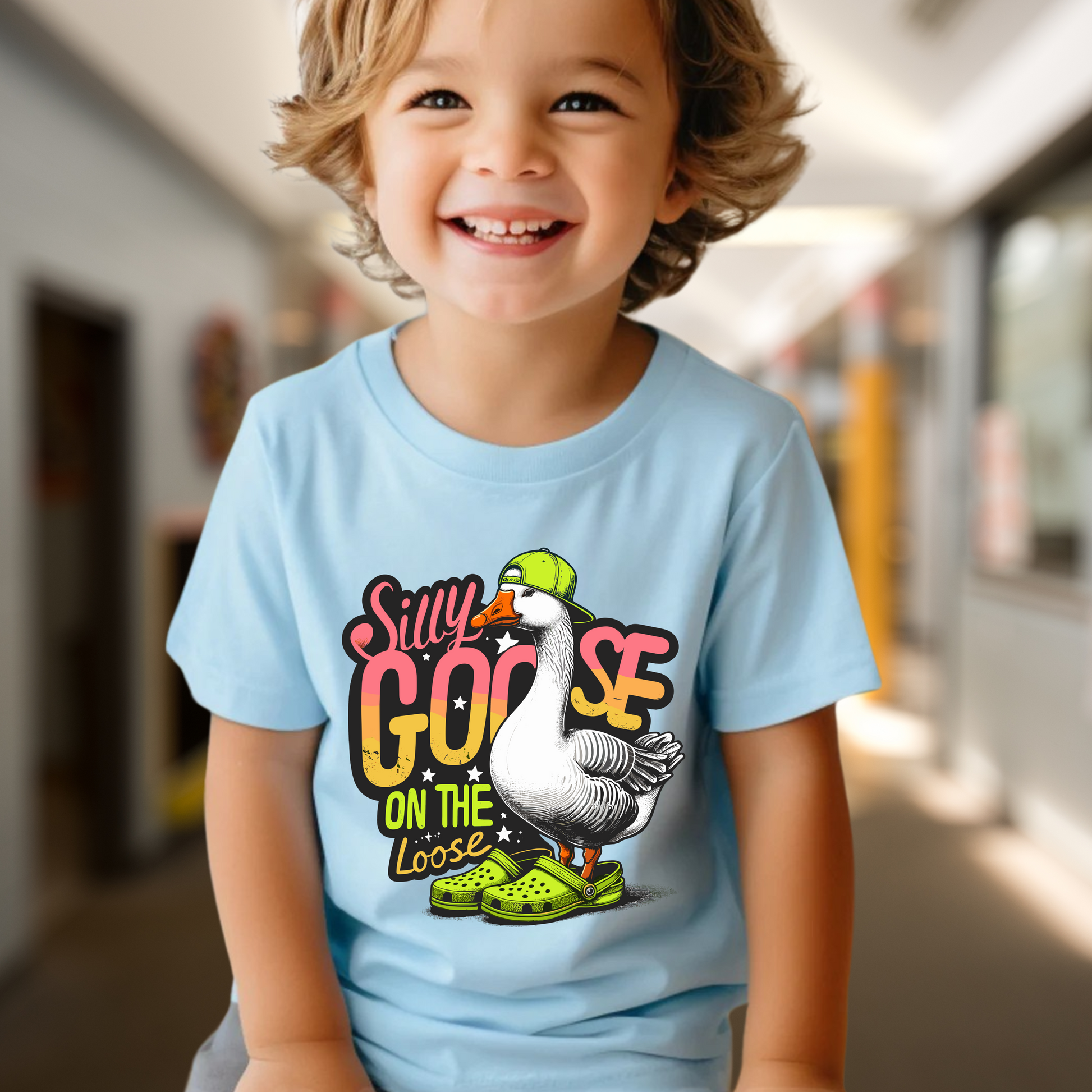 Let your little one strut in style with this "Silly Goose On The Loose" toddler tee. Featuring a too cool goose rocking a backwards hat and oversized Crocs, this shirt adds playful attitude to any outfit. Perfect for kids who love to stand out and spread fun wherever they go.