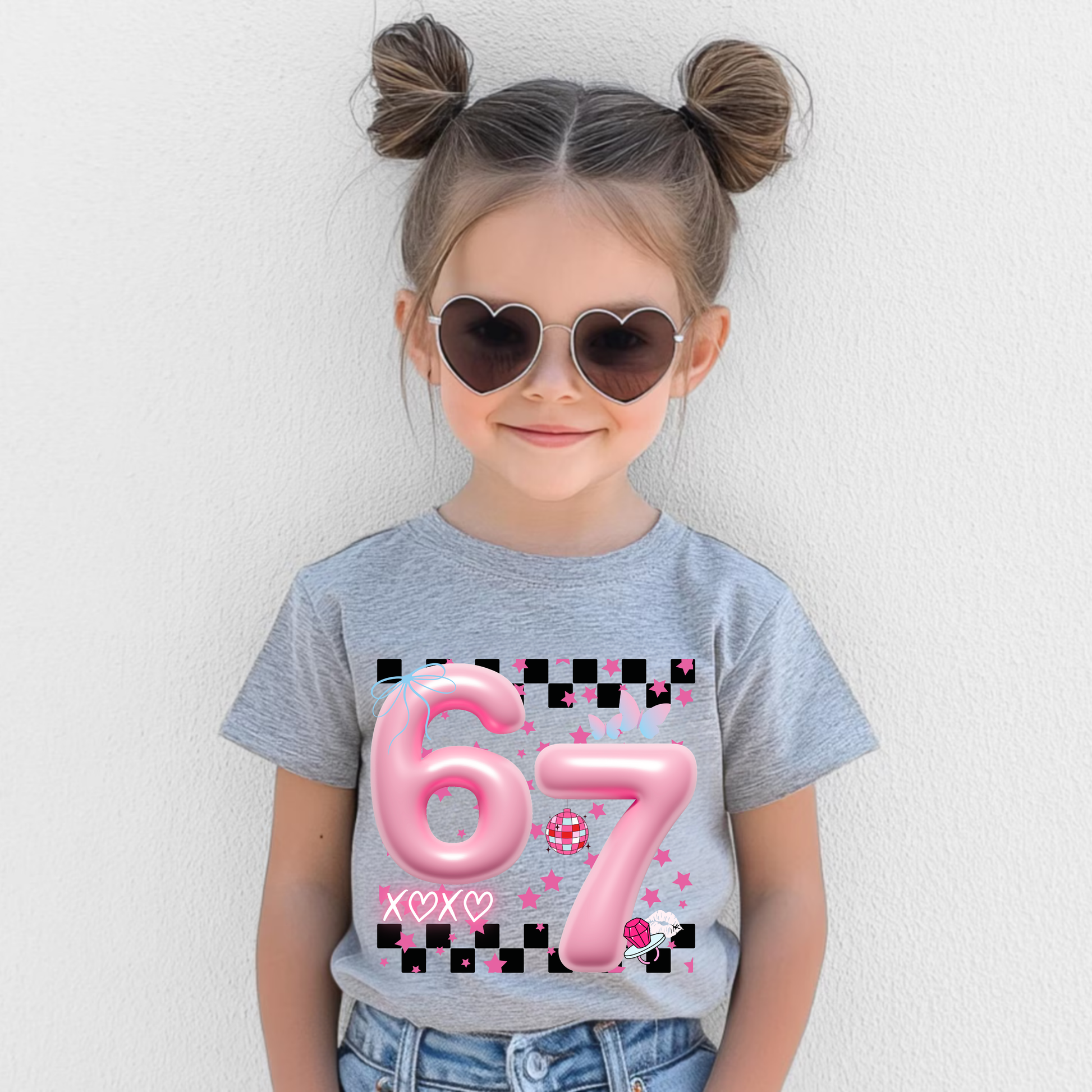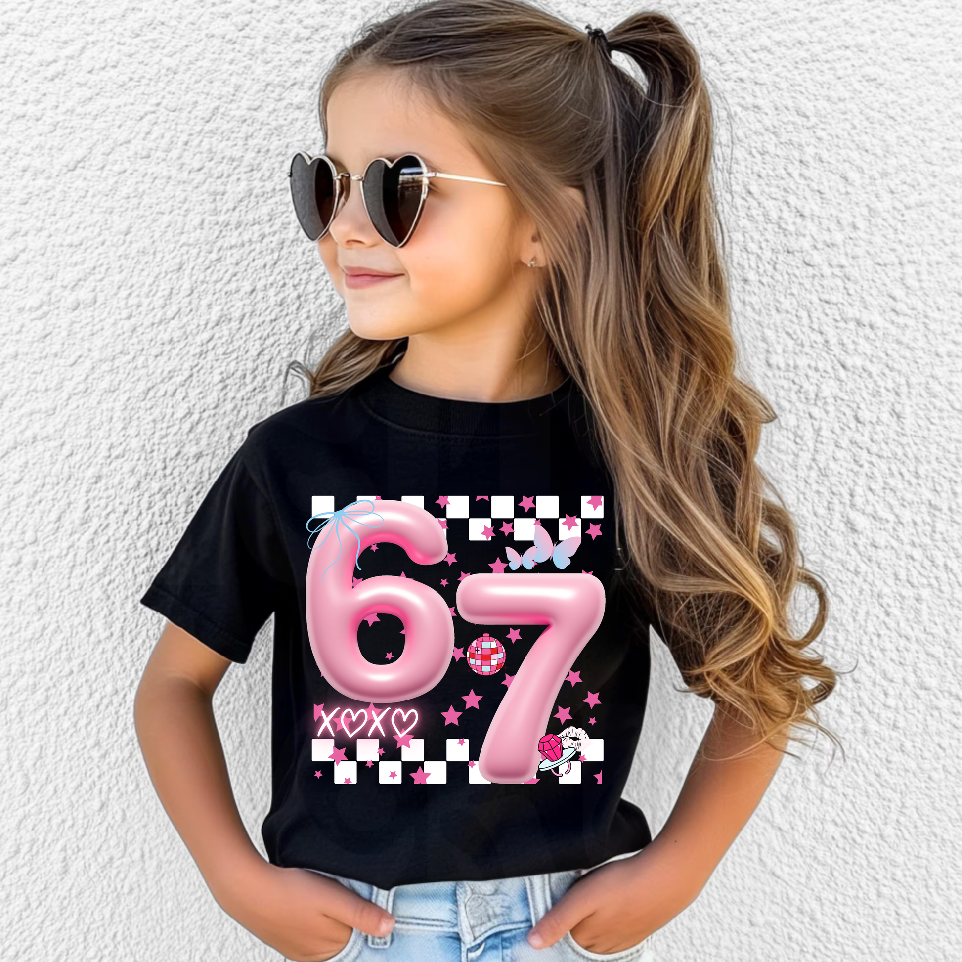 This playful youth girls’ t-shirt features the trendy "6 and 7" design set against a stylish checkered background. Adorned with cute, girly images, it brings a fun and fashionable touch to any outfit. Perfect for young trendsetters, this tee combines comfort and charm for everyday style with a fresh, vibrant edge.