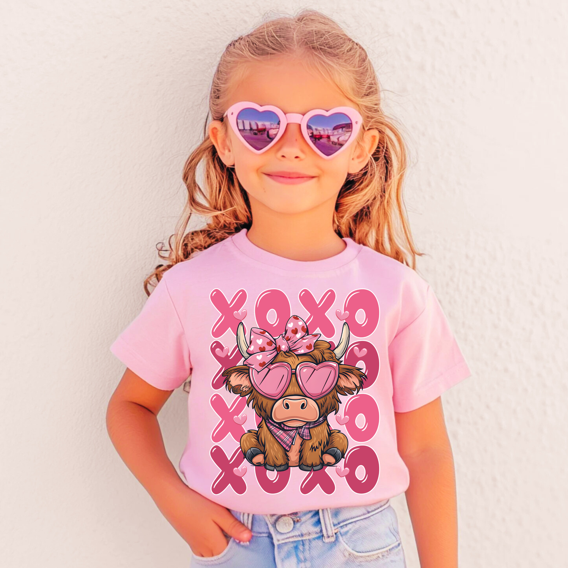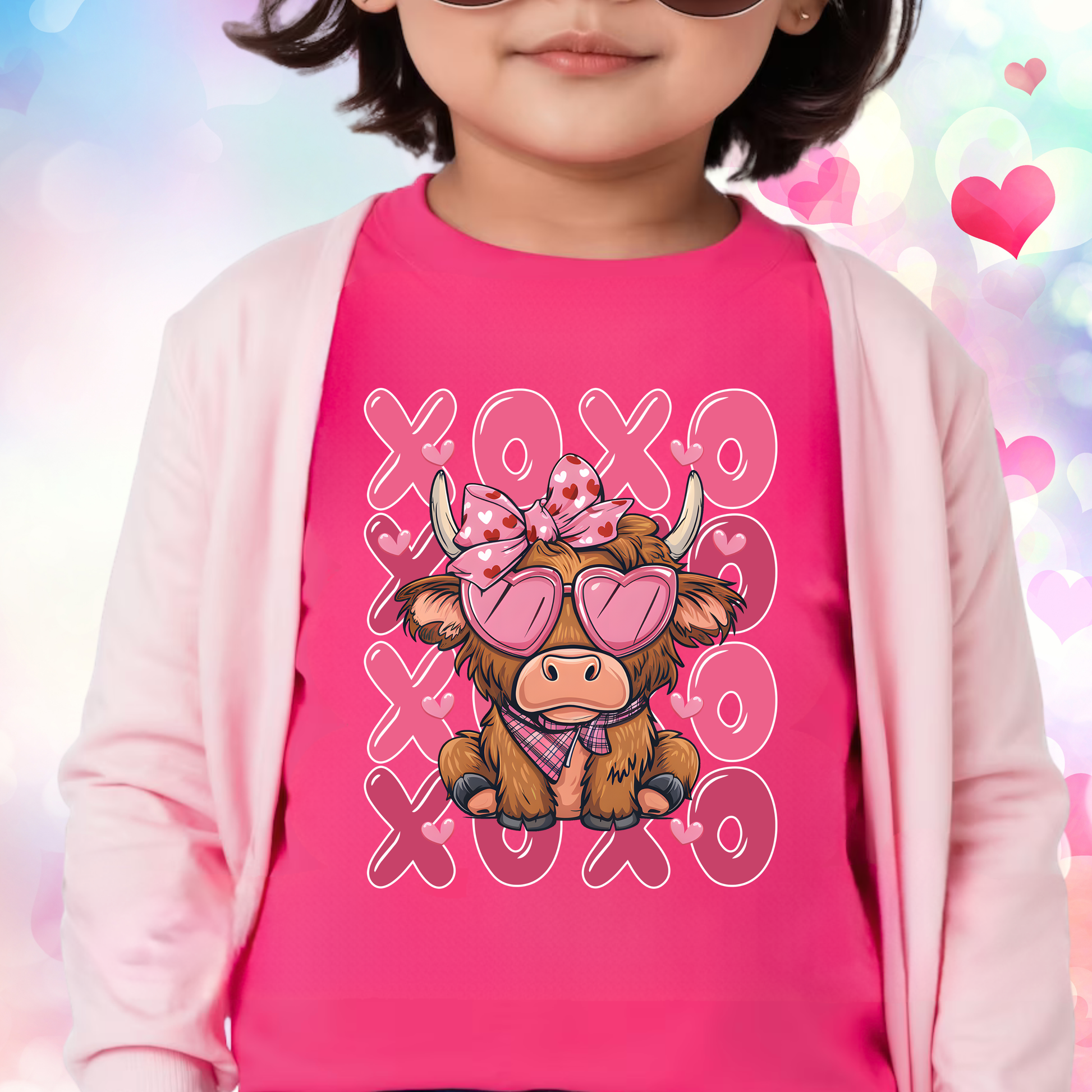 Spread love this Valentine's season with our adorable toddler tee! Featuring a charming Highland cow sporting heart-shaped glasses, a silky pink bow, and a cozy scarf, surrounded by playful "XOXO" text in cheerful pink. Perfect for little ones who love cute animals and festive vibes. Soft, comfortable, and absolutely Instagram-worthy for holiday photos!